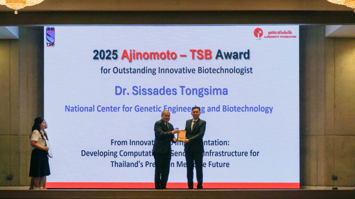 เมื่อวันที่ 29 ตุลาคม 2568 ที่ผ่านมา มูลนิธิอายิโนะโมะโต๊ะ นำโดย คุณธีระชัย ขันธิกุล กรรมการ รองเลขาธิการ และผู้ช่วยรองเหรัญญิก มอบโล่รางวัล Ajinomoto – TSB Award ประจำปี 2568 พร้อมทุนสนับสนุนงานวิจัย มูลค่า 100,000 บาท แก่ ดร.ศิษเฎศ ทองสิมา ผู้อำนวยการธนาคารทรัพยากรชีวภาพแห่งชาติ (National Biobank of Thailand) สังกัดศูนย์พันธุวิศวกรรมและเทคโนโลยีชีวภาพแห่งชาติ (BIOTEC), สำนักงานพัฒนาวิทยาศาสตร์และเทคโนโลยีแห่งชาติ (สวทช.)