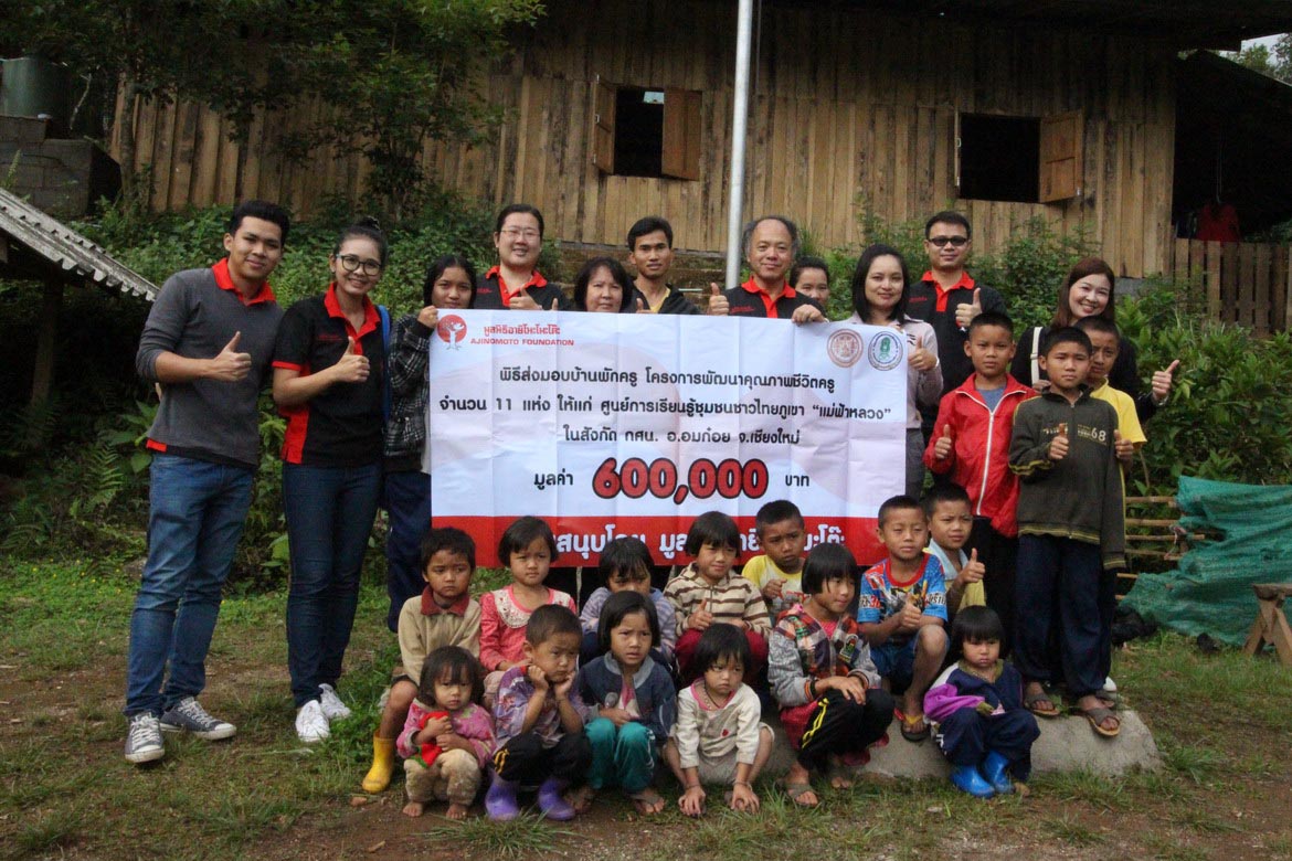 มูลนิธิอายิโนะโมะโต๊ะ ได้ร่วมกับ มหาวิทยาลัยเทคโนโลยีพระจอมเกล้าธนบุรี (มจธ.) ในการจัดทำโครงการ “พัฒนาคุณภาพชีวิตครู” และมอบเงินสนับสนุนการก่อสร้างบ้านพักครู เมื่อวันที่ 17 เมษายน 2557 ซึ่งการก่อสร้างได้เสร็จสิ้นเรียบร้อยแล้ว มูลนิธิฯ นำทีมโดย สุรเดช เธียไพรัตน์ ผู้แทนกรรมการมูลนิธิอายิโนะโมะโต๊ะ และกรรมการ บริษัท อายิโนะโมะโต๊ะ (ประเทศไทย) จำกัด พร้อมทีมงานมูลนิธิฯ และ ผ่องศรี กติกาโชคสกุล ผู้แทนจาก มจธ. เดินทางไปส่งมอบอาคารบ้านพักครู ณ ศูนย์การเรียนรู้ชุมชนชาวไทยภูเขา “แม่ฟ้าหลวง” บ้านห้วยแห้ง อ.อมก๋อย จ.เชียงใหม่ เพื่อส่งมอบบ้านพักครูจำนวน 11 แห่ง มูลค่ารวม 600,000 บาท รับมอบอาคารโดย เจริญ ธรรมบัณฑิต ผู้อำนวยการกศน. อมก๋อย เมื่อวันที่ 25 พฤษภาคม 2558 พิธีส่งมอบเป็นไปอย่างเรียบง่าย อบอุ่นและประทับใจในการต้อนรับของครู นักเรียนและชาวบ้านในชุมชน