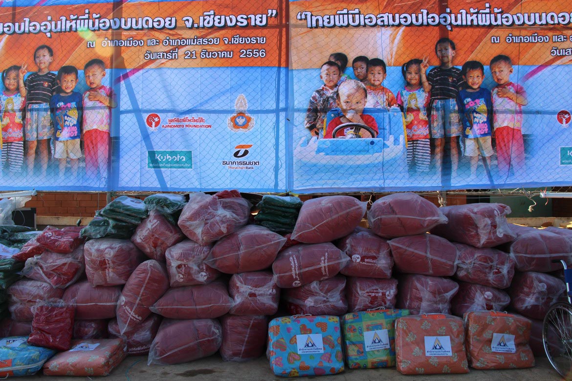 มูลนิธิอายิโนะโมะโต๊ะ ร่วมกับรายการ “สถานีประชาชน” ทางสถานีโทรทัศน์ไทยพีบีเอส เพื่อมอบผ้าห่มจำนวน 2,600 ผืน มูลค่า 650,000 บาท ให้แก่ ผู้ประสบภัยหนาวในเขต ตำบลท่าก๊อ อำเภอแม่สรวย และ ต.แม่ยาว ตำบลแม่ยาว อำเภอเมือง จังหวัดเชียงราย ตลอดจน โรงเรียนที่ด้อยโอกาสและศูนย์เด็กเล็กชาวเขาในจังหวัดเชียงราย โดยมีการไปร่วมมอบผ้าห่มผ่าน คุณสมชัย สุวรรณบรรณ ผู้อำนวยการสถานีโทรทัศน์ไทยพีบีเอส เมื่อวันที่ 12 ธันวาคม นำทีมโดยคุณพิเชียร คูสมิทธิ์ รองประธานมูลนิธิฯ และ คุณสุชาติ นาคเสวก กรรมการมูลนิธิฯ หลังจากนั้นได้มีการปล่อยขบวนรถอย่างเป็นทางการเมื่อวันที่ 19 ธันวาคม 2556 เพื่อมุ่งหน้าสู่จังหวัดเชียงรายและทำพิธีมอบในวันที่ 21 ธันวาคม 2556 นำทีมมอบโดย มร.เทะสึยะ นะคะโนะ และ คุณสุชาติ นาคเสวก กรรมการมูลนิธิฯ งานนี้ทั้งเด็กนักเรียนและชาวบ้านในชุมชน ได้คลายความหนาวกันอย่างถ้วนหน้า